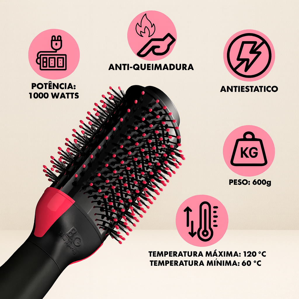 Essa escova é ideal para quem busca praticidade, segurança e resultado profissional todos os dias. Diga adeus ao frizz e ao tempo perdido, com essa escova, você está pronta em minutos!