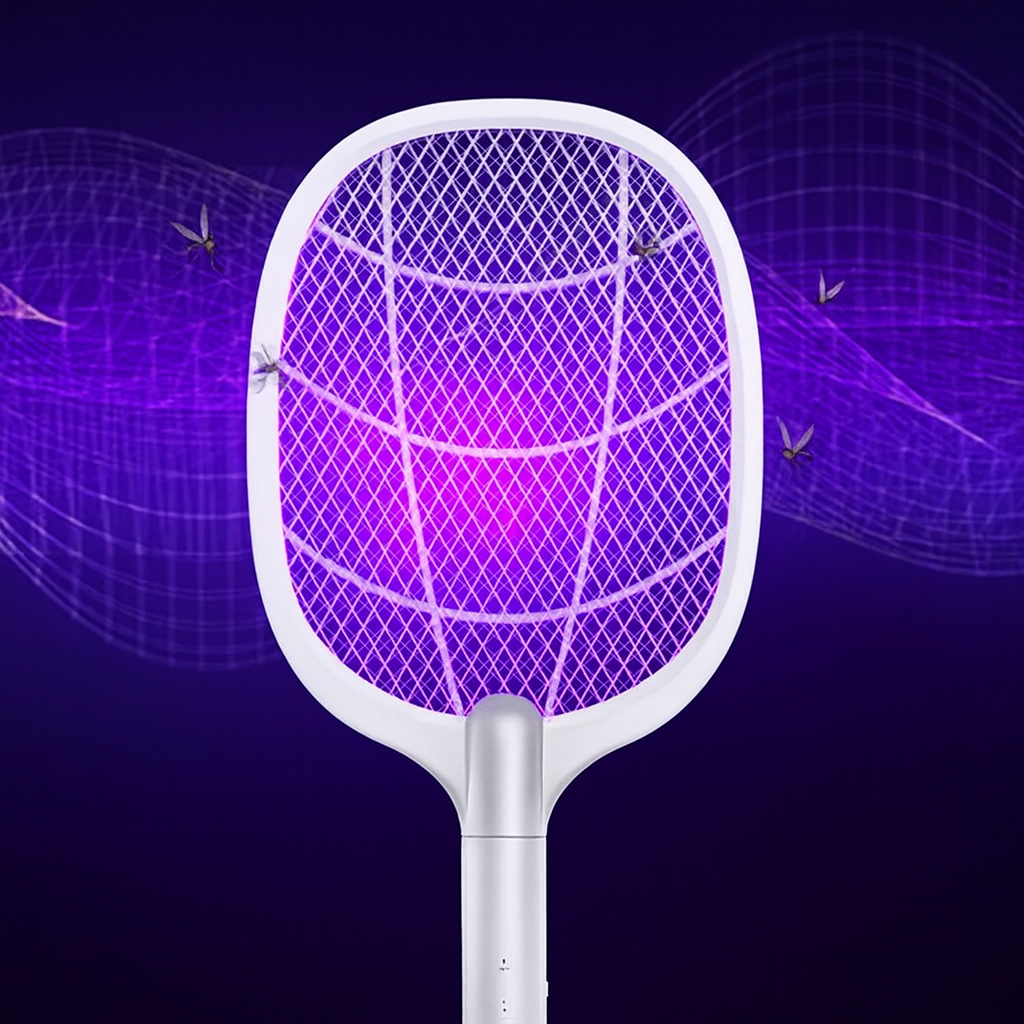 Raquete Elétrica Mata Insetos Recarregável com Base e Luz LED.